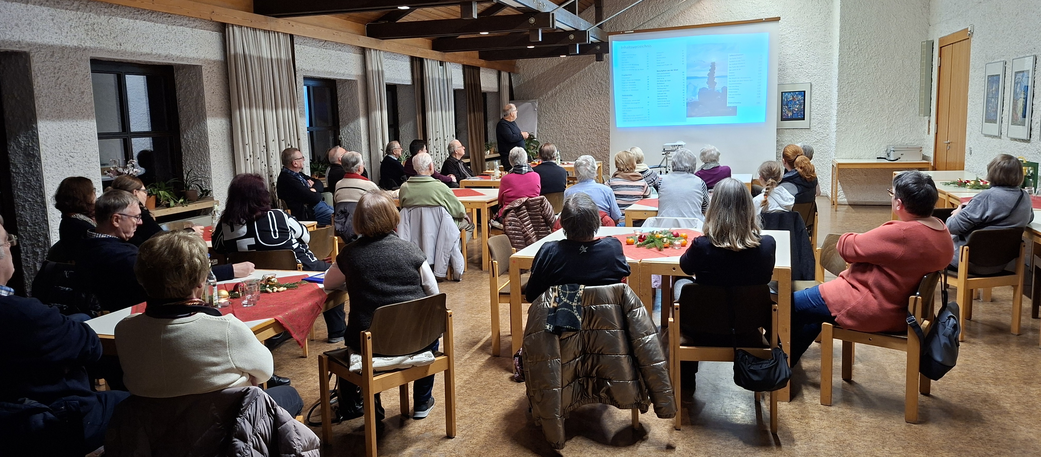 In seinem Vortrag griff Stephan Neufanger zahlreiche Bilder und Vergleiche auf, die den Zuhörerinnen und Zuhörern den Zugang zu existenziellen Fragen erleichterten. Das Leben beschrieb er als einen Fluss, in dem der Blick zurück nur Erinnerungen weckt, während der Blick nach vorne stets mit Ungewissheit verbunden ist – und doch bewegt sich der Mensch mit dem Strom des Lebens weiter. Ein weiterer Gedanke war der „Fels in der Brandung“: weniger als Symbol unerschütterlicher Härte, sondern vielmehr als Halt und Schutz, an dem man sich festmachen kann – sinnbildlich für Christus.