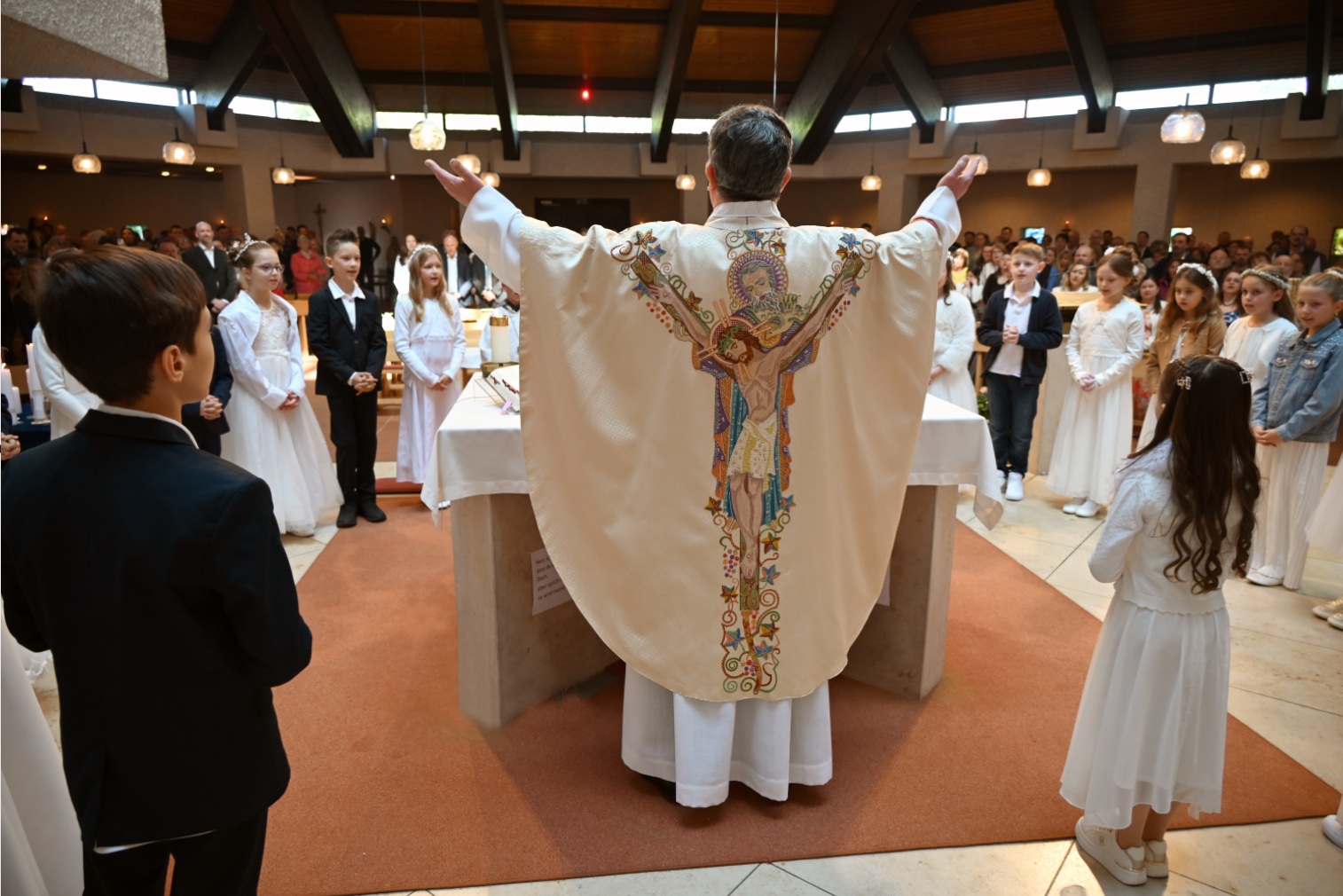 Am 26. April feierten 24 Kinder ihre Erstkommunion in Corpus Christi, auf die sie sich seit Oktober 2025 vorbereitet haben. Regelmäßig trafen sich die Kinder und erfuhren in kleinen Gruppen die Bedeutung der Erstkommunion als Sakrament. Gott bringt uns Heil, er will Segen und Frieden geben. Jesus steht im Mittelpunkt, die Eucharistie ist die Mitte unseres Glaubens. Glaube geht dauerhaft nur in der Gemeinschaft zusammen mit Menschen,