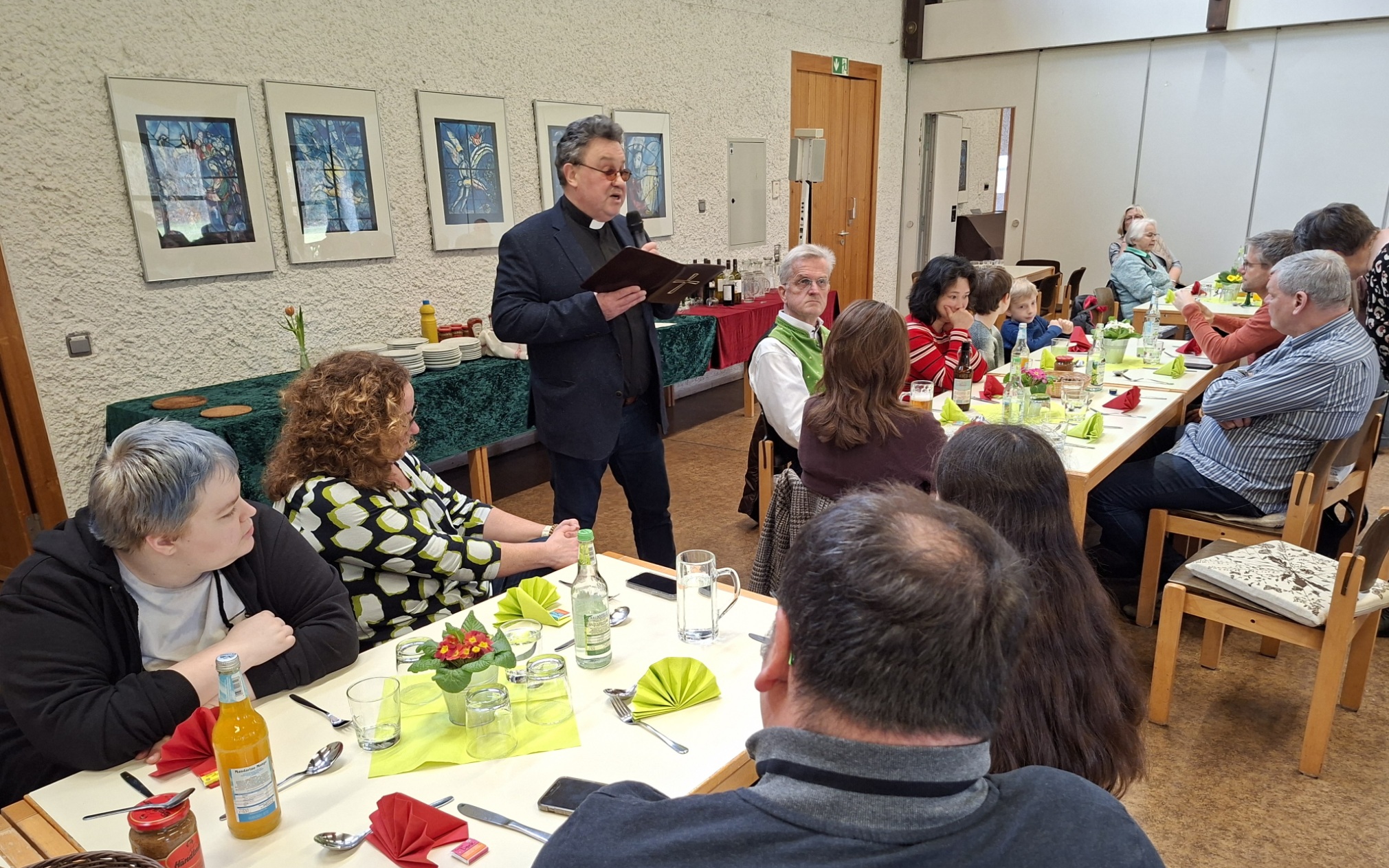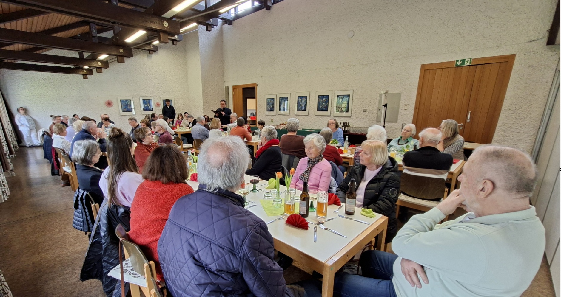 Viele ehrenamtlichen Helfer waren der Einladung zum Helferfest gefolgt. Es waren sogar so viele Ehrenamtliche gekommen, dass noch weitere Tische gestellt werden mussten, da sonst der Platz nicht gereicht hätte. Pfarrvikar Vulpe bedankte sich bei allen ehrenamtlichen Helfern, die sich während des letzten Jahres in den unterschiedlichsten Bereichen und Gruppen engagierten. Er meinte: "Das sei nicht selbstverständlich. Ohne Euch könne eine Pfarrgemeinde im wahrsten Sinn des Wortes nicht leben und erlebbar sein. Ihr sind mehr als wichtig für das Leben der Kirche hier vor Ort. Solche Gruppen seien das Kommunionvorbereitungsteam, das Seniorenteam, die Gartengruppe, die musikalischen Gruppen, die Kirchortsräte, die Kirchenverwaltung, die liturgischen Gruppen und viele andere mehr. Auf Euch Aktive ist Verlass. Danke, Danke, Danke!"
