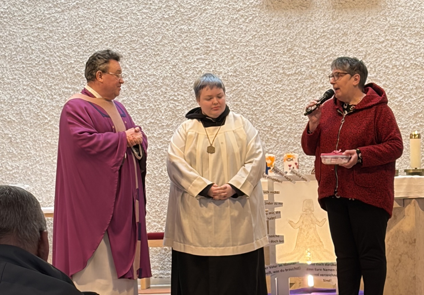 Während des Familiengottesdienstes bedankte sich Pfarrvikar Vasile Vulpe bei Oberministrant Toby für seinen langjährigen Dienst. Auch KOR-Vorsitzende Regina Serfort dankte Toby und verabschiedete ihn mit einem kleinen Präsent.