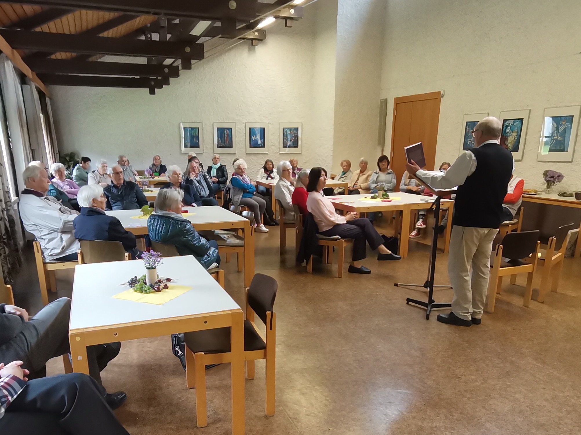 Georg Langenhorst liest im Pfarrsaal aus seinem Buch vor 35 Zuhörerinnen und Zuhörern.