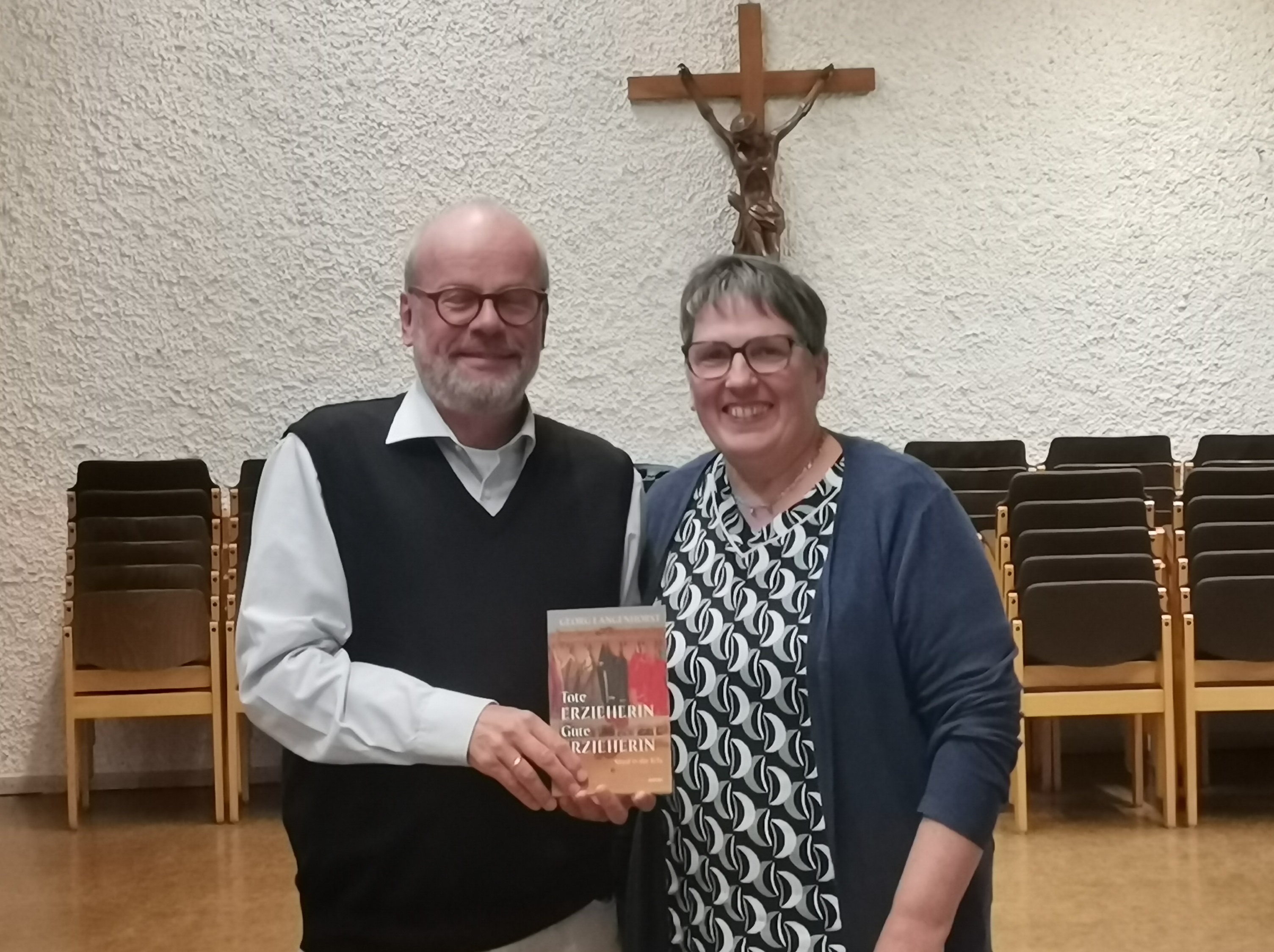 Höhepunkt des Nachmittags war der Beitrag des Autors Prof. Georg Langenhorst, der sein Buch "Tote Erzieherin – Gute Erzieherin" vorstellte. Georg Langenhorst ist Professor für Didaktik des Katholischen Religionsunterrichts/Religionspädagogik an der Katholisch-Theologischen Fakultät der Universität Augsburg. Außerdem ist er auch Autor von Kriminalromanen. Georg Langenhorst schilderte zunächst in seiner mitnehmenden Art, wie seine Geschichten und Protagonisten entstehen. Langenhorst hat nämlich keine Vorabgliederung für seine Kriminalromane. Die einzelnen Szenen und die Charaktäre der Personen entstehen nach und nach als kleine Mosaiksteinchen, die sich dann am Ende in ein Ganzes zusammenfügen.
