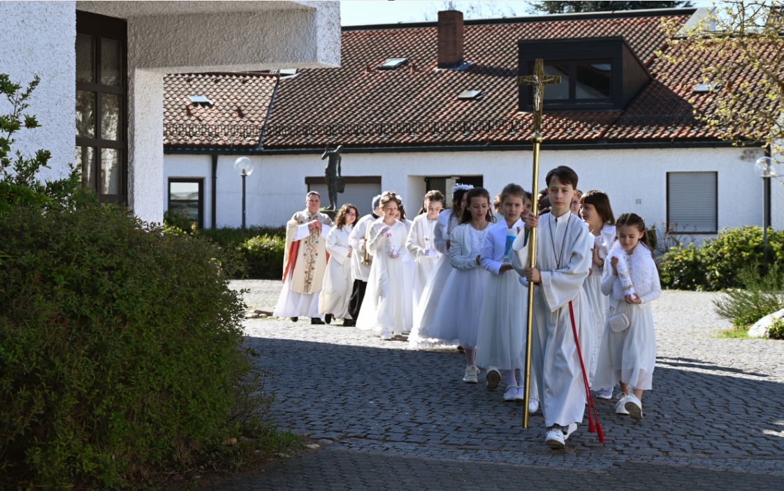 Am 26. April feierten 24 Kinder ihre Erstkommunion in Corpus Christi, auf die sie sich seit Oktober 2025 vorbereitet haben. Regelmäßig trafen sich die Kinder und erfuhren in kleinen Gruppen die Bedeutung der Erstkommunion als Sakrament. Gott bringt uns Heil, er will Segen und Frieden geben. Jesus steht im Mittelpunkt, die Eucharistie ist die Mitte unseres Glaubens. Glaube geht dauerhaft nur in der Gemeinschaft zusammen mit Menschen,