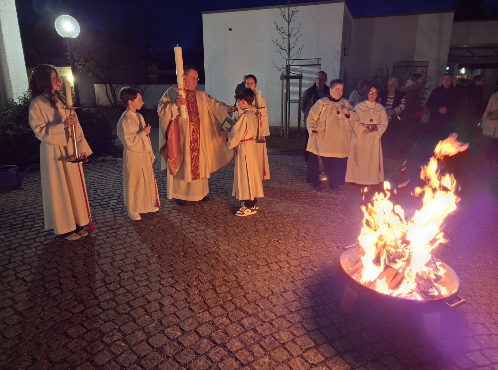 Das Osterfeuer ist entfacht, an ihm wird die Osterkerze entzündet.
