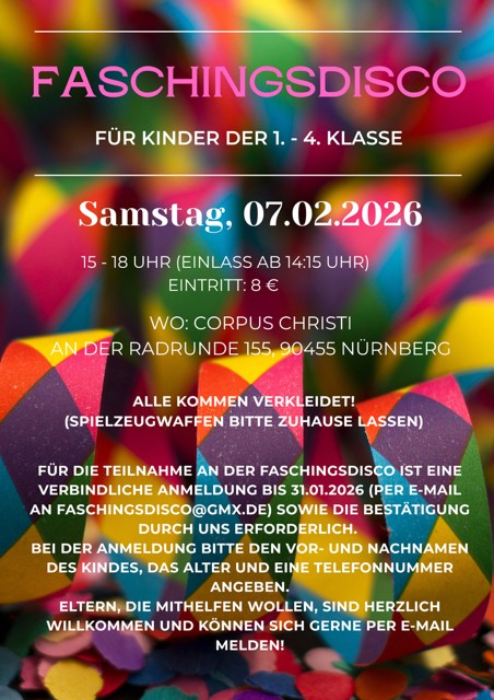 für Kinder der 1. bis 4. Klasse am Samstag, 07. Februar 2026 von 15 bis 18 Uhr im Pfarrsaal von Corpus Christi Eintritt 8 EUR